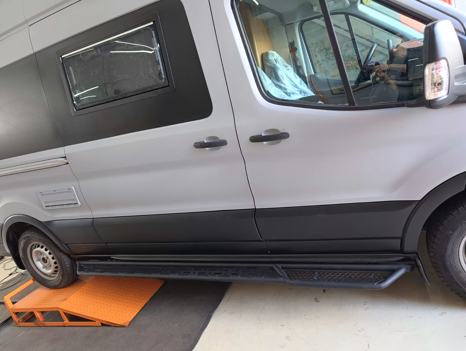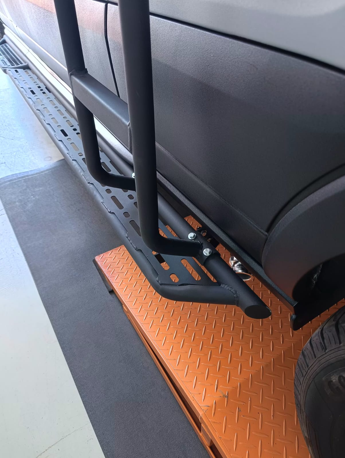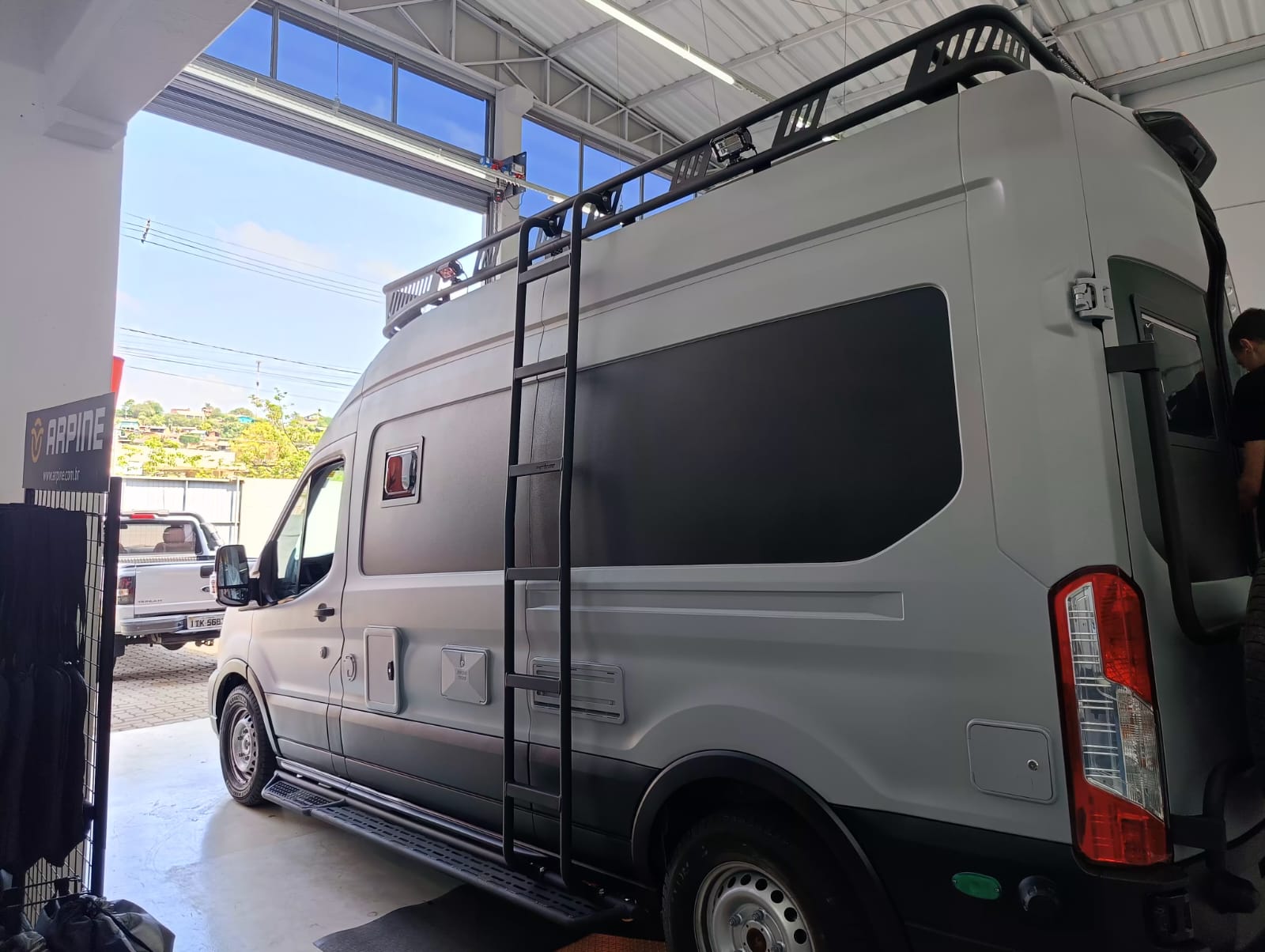 Nos estribos V-trek podem ser adaptados a escada lateral para subir no teto da van.